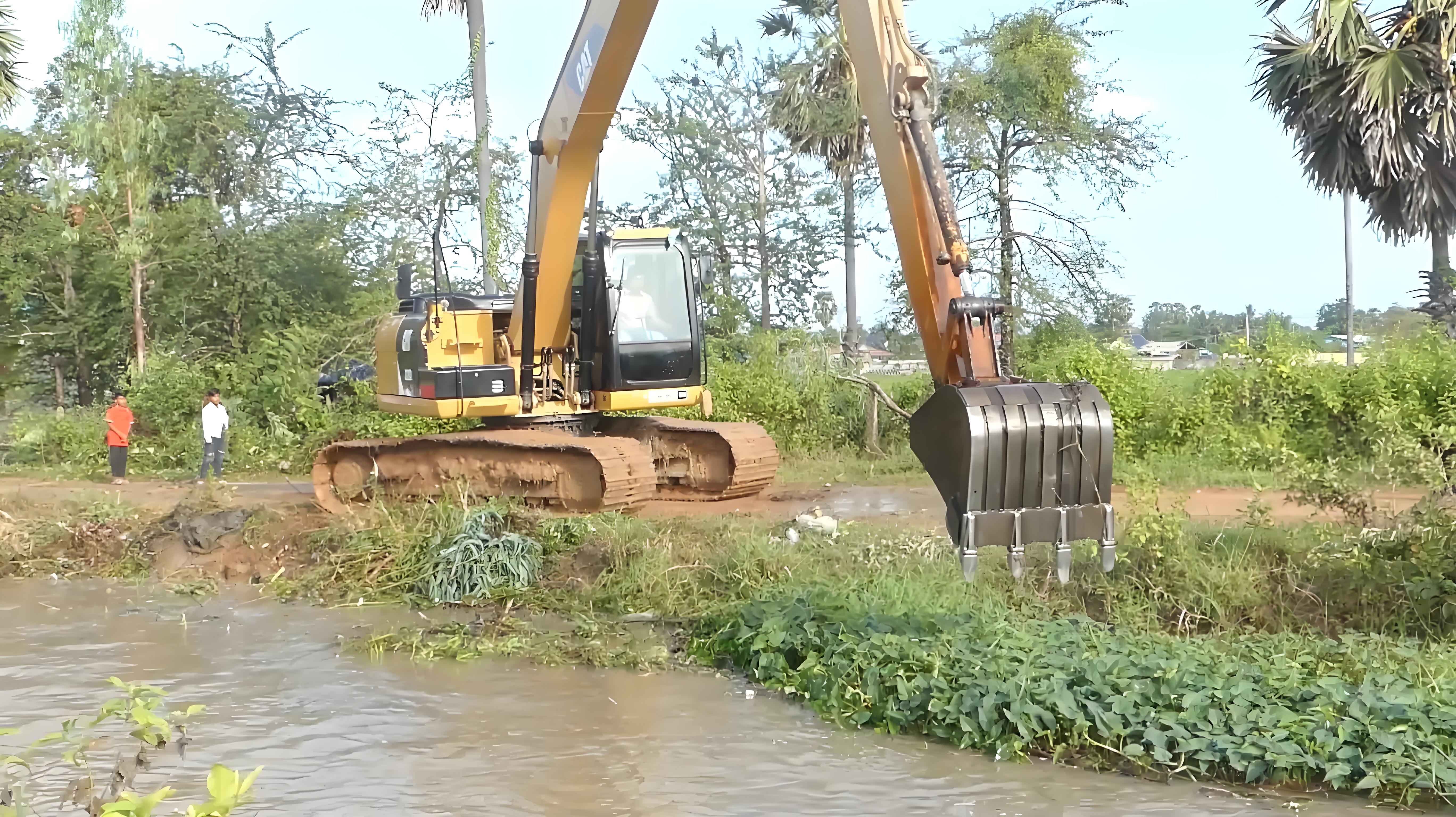 - 水草的密度和纏繞程度:如果是零星分布的水草,挖機(jī)作業(yè)基本不受影響;但要是水草長(zhǎng)成了 “水下森林”,根莖纏繞成網(wǎng)狀,挖斗很容易被纏住,每挖幾斗就得停下來(lái)清理,效率會(huì)大打折扣。這種情況下,可能需要先用割草機(jī)把水面和淺層的水草割斷,再用挖機(jī)清淤。
